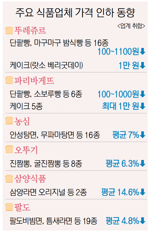 단팥빵이 100원 내려 1,800원, 밤식빵은 400원 내려 6,400원